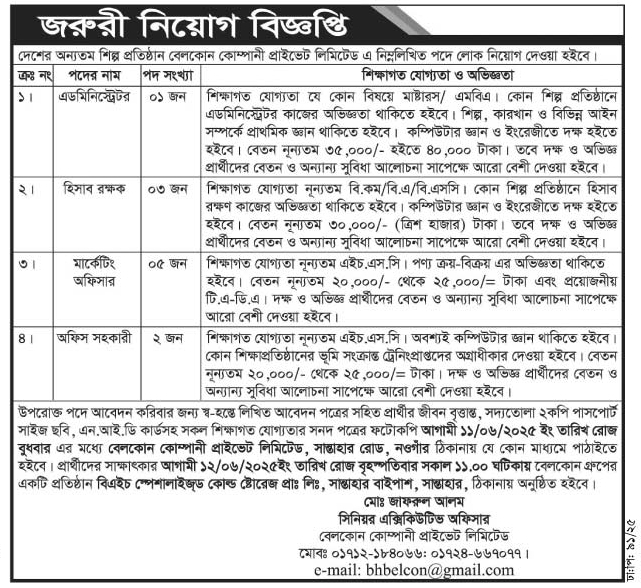 Belcon Company has recently published its latest job circular for 2025, offering excellent career opportunities for dynamic, skilled, and motivated individuals. As one of the reputable companies in the industry, Belcon is looking to expand its team with energetic professionals who are ready to contribute to the company’s growth. The circular includes multiple vacancies in various departments, ranging from administrative roles to technical and field-based positions. Candidates from all over the country who meet the qualifications are encouraged to apply.